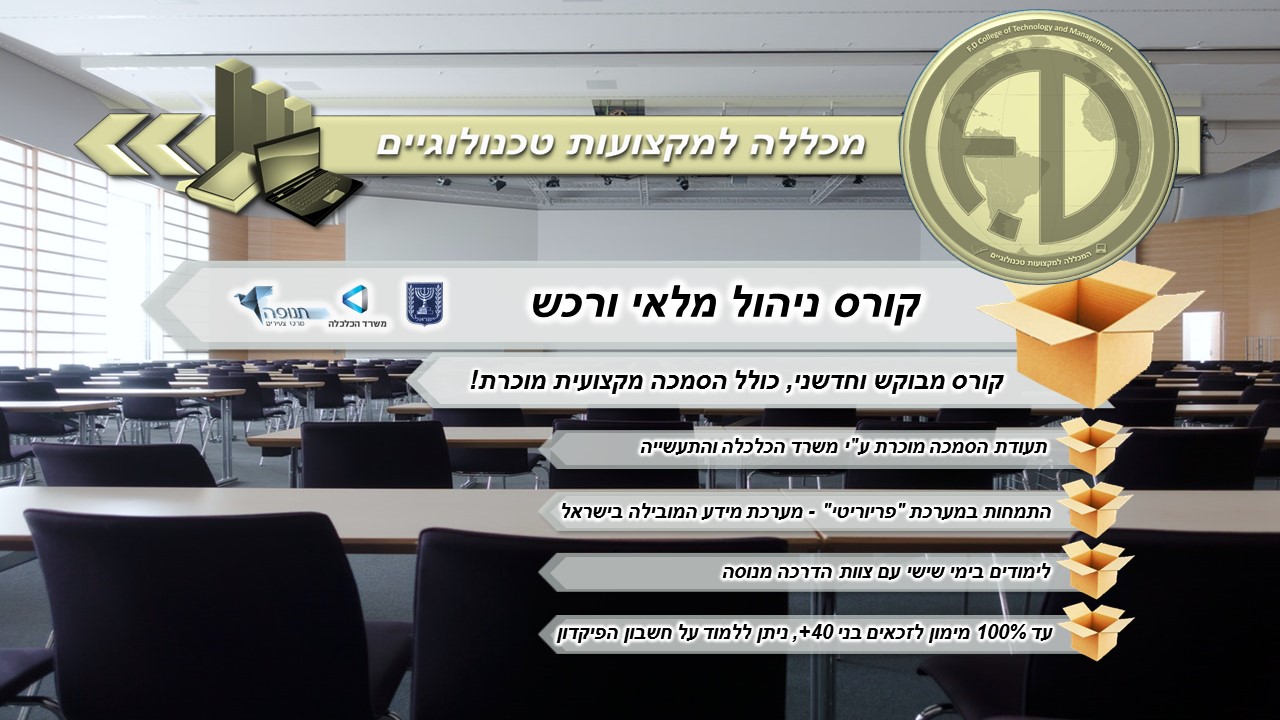 מכשירה עובדים ומנהלים לניהול לוגיסטי במפעלים ובעסקים שונים. בוגרי קורס זה זוכים לקורס נדרש אשר מאפשר להם להשתלב במהירות בתפקידים מעניינים בתעשייה.