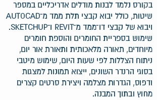 הקורס מיועד בעיקר להנדסאי אדריכלות ואדריכלים המעוניינים להפיק הדמיות פוטו-ריאליסטיות של מבנים ועיצוב פנים.