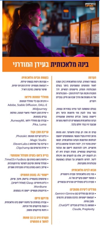 קורס זה אינו רק קורס תיאורטי אלא מהווה מרחב למידה פעיל ומעשי. המשתתפים יכירו את עולמות החדשנות והבינה המלאכותית, יפגשו יזמים פורצי דרך, ילמדו ויתרגלו שימוש בכלים השונים, וזאת מכיוון שמטרת הקורס אינה אך ורק הקניית ידע, אלא גם העצמה של היכולת ליצור,
